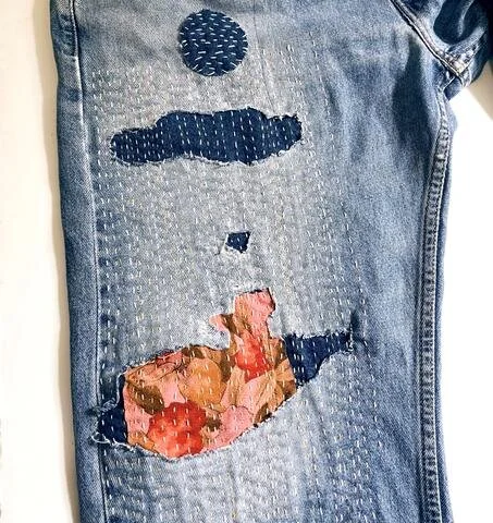 In Japanese culture stitch work mending is an art form, and it’s called Sashiko. It literally translates to “little stabs” and focuses on simple-patterned stitches. Whether it’s clean lines, concentric circles, cross stitch, starburst. . . Sashiko is all about embracing the uniqueness of the imperfection. Your stitches don’t have to be the exact same length or perfect distancing - any asymmetry will just add character.