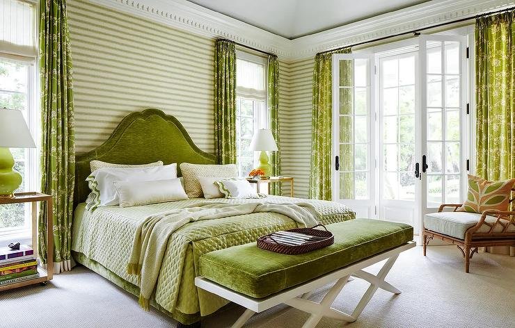 During one of my collegiate years I painted my bedroom a pea’ish green (almost Kermit the frog green), and in my humble opinion it looked really great against the wood flooring, and also made my funky artwork pop quite dramatically. I love the way the olive green bedroom below has incorporated fun patterning with the striped wallpaper.